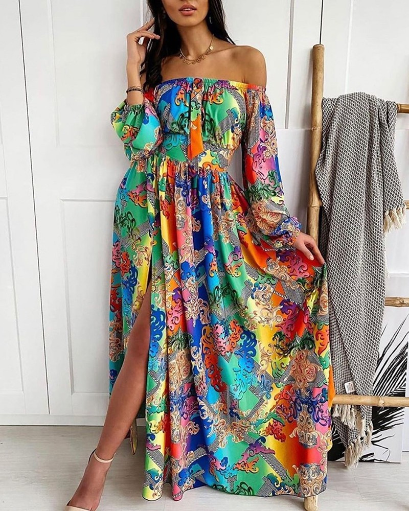 Sukienka maxi w stylu hiszpanki z odkrytymi ramionami i długimi, luźnymi rękawami zakończonymi delikatnym ściągaczem. Wykonana z lekkiego, przewiewnego materiału, zdobiona intensywnym, kwiatowym wzorem. Rozcięcie na nodze dodaje zmysłowości i swobody ruchów. Idealna na letnie spacery, wakacje i wyjątkowe okazje w plenerze.